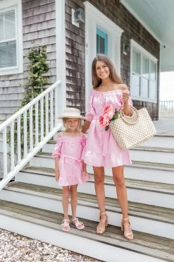 - Quarter length sleeves with a tie waist, ruffle hem, and off the shoulder styleΒ