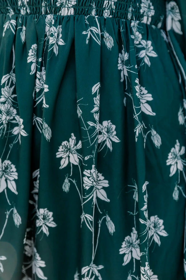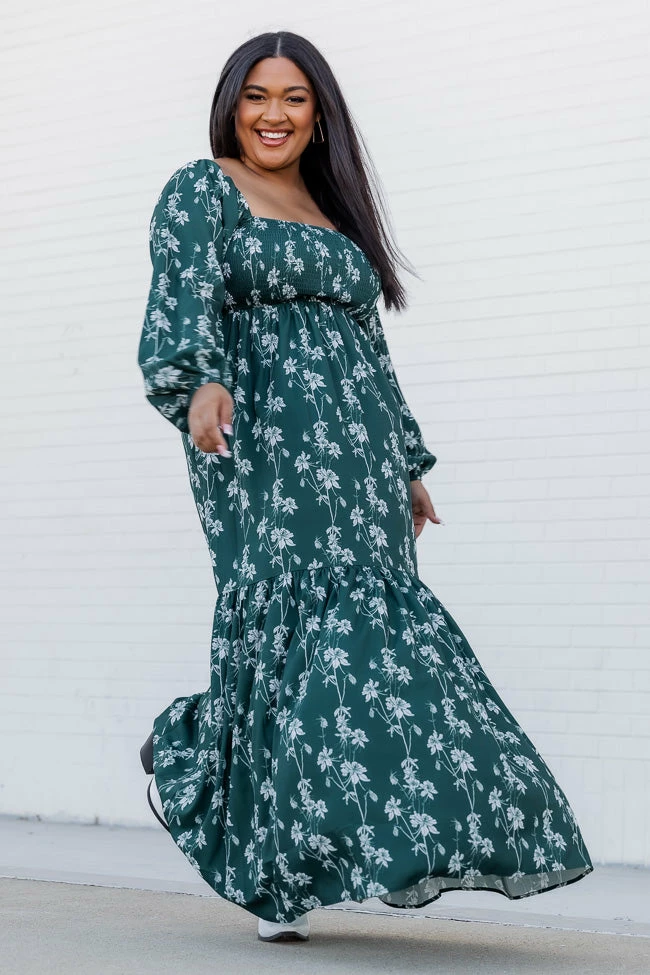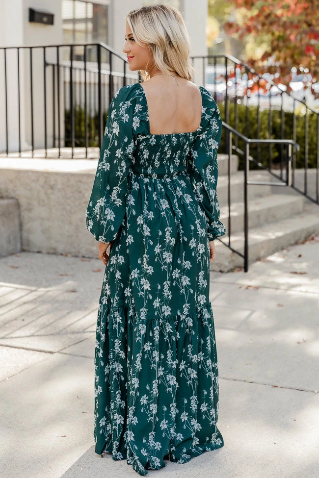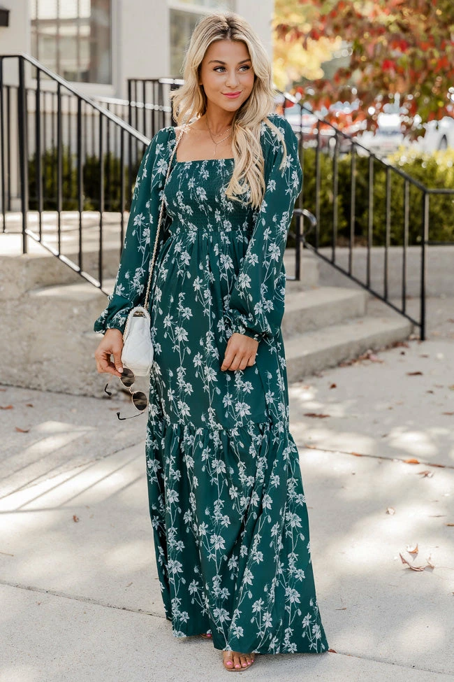 - Square neckline with smocked bust, long sleeves, tiered ruffled skirt, and maxi length