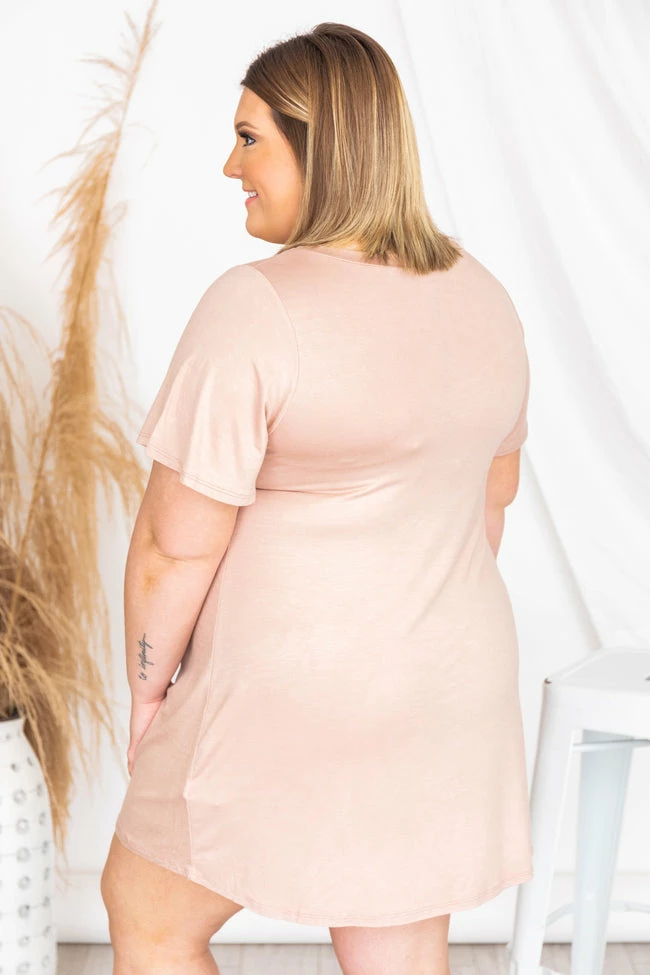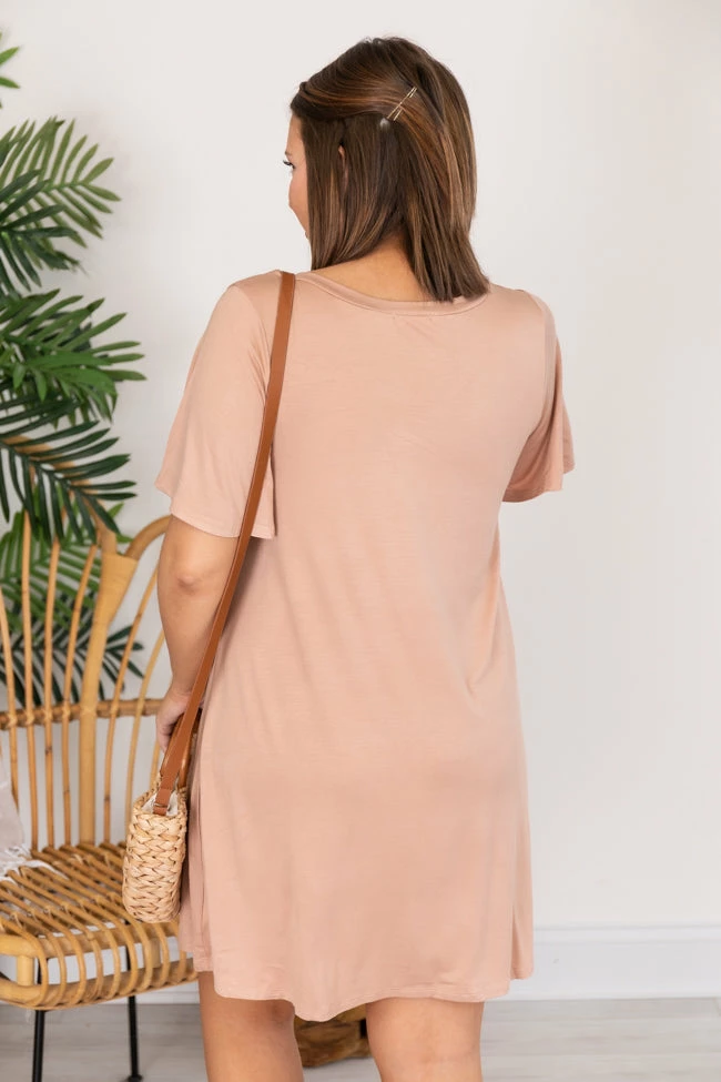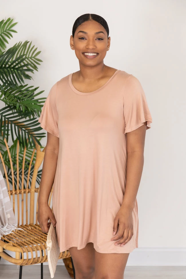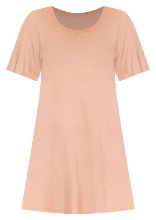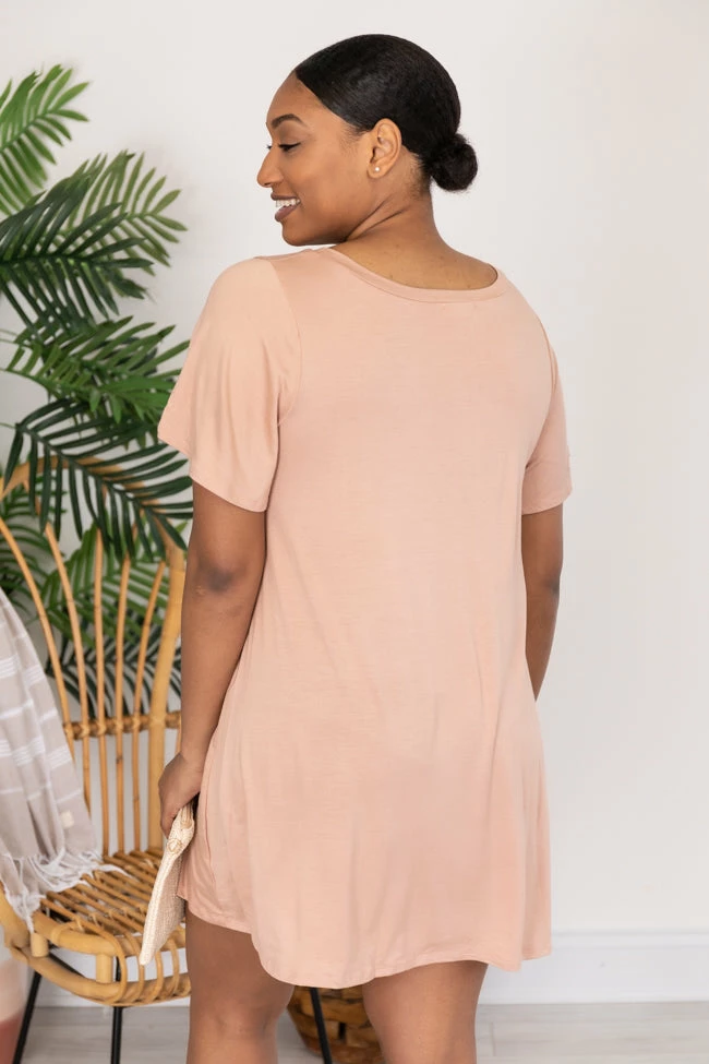 This T-shirt dress is such a must-have for spring or any fun vacation. The classic shade of light peach and the round neck collar is so cute – we love this stylish dressΒ it’s such a timeless piece.Β This dress is so comfortable and can be style so many ways! Pair with a jean jacket and sneaker or dress it up with wedges and a necklace!