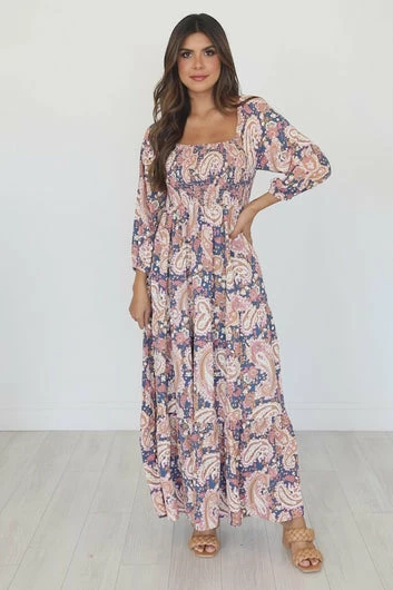 - Square neckline with 3/4 sleeves and smocked bust and maxi length