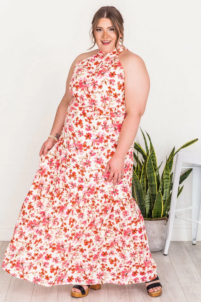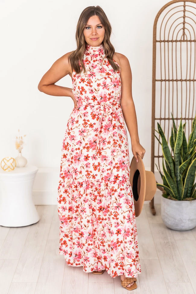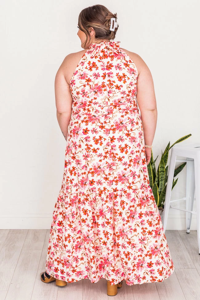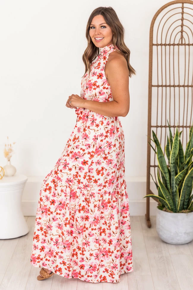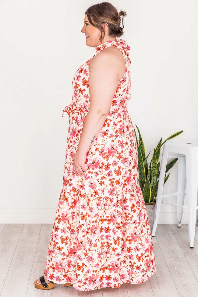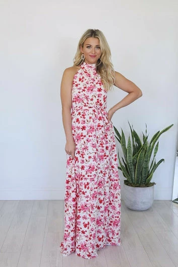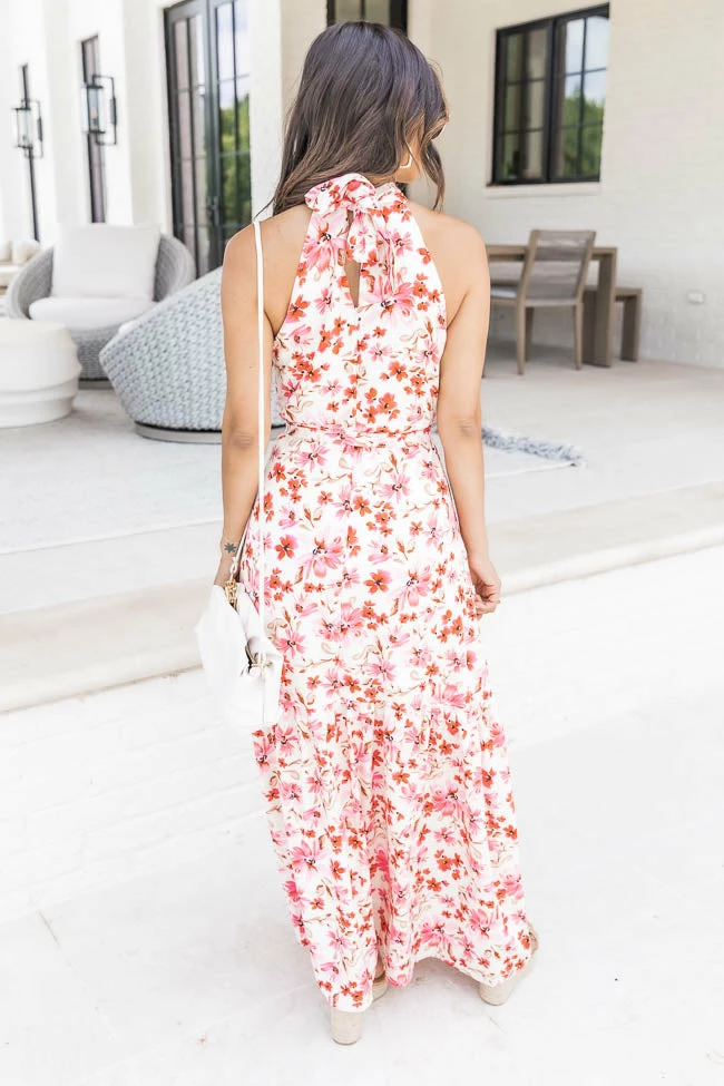 - Self tying halter neckΒ style with a maxi length and tie waist