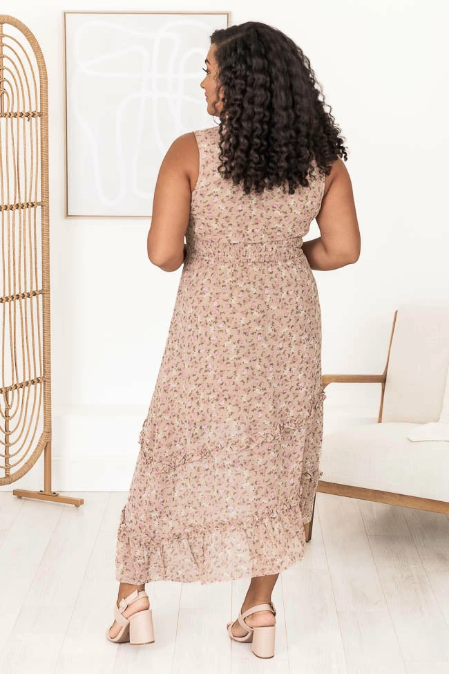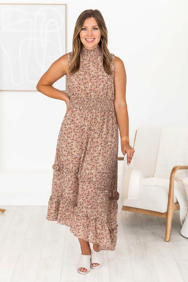 - Ruffled mock neck with tank cut, smocked waist, tiered ruffled detailing