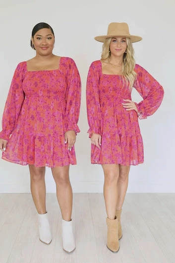 - Red and fuchsia floral dress