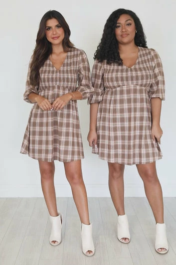 - V-neckline with smocked bust, 3/4 balloon sleeves, and mini length
