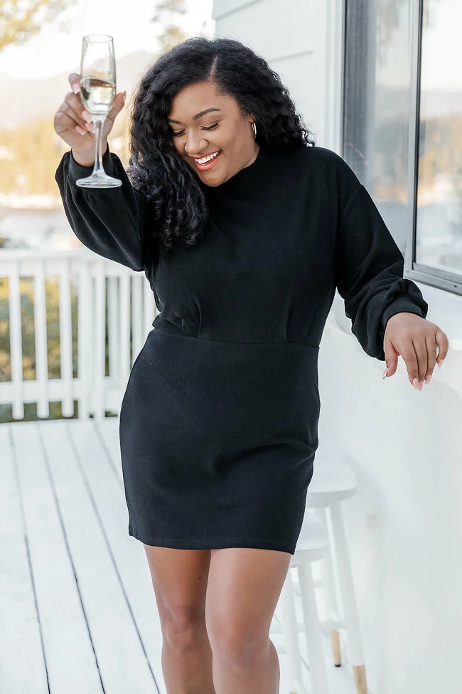 - Mock neck with long balloon style sleeves, button neck closure, and mini length