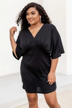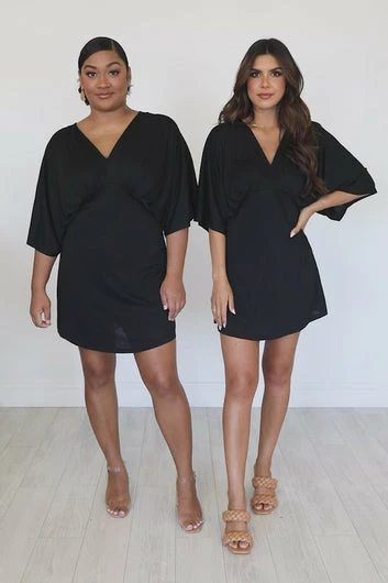 - V-neckline with draped bust detail, short sleeves, and mini length