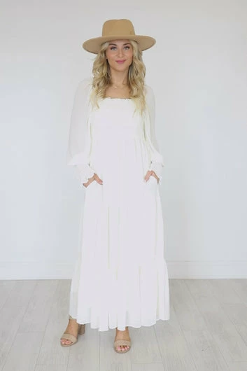 - Square neckline with smocked bust, long bishop style sleeves with smocked hem, and tiered ruffled skirt