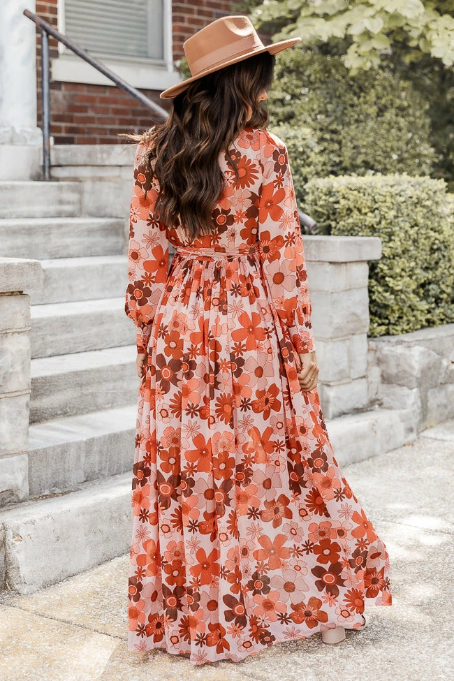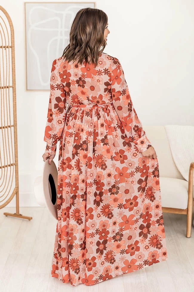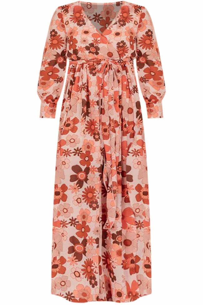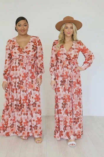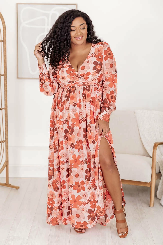 - Wrap style v-neckline with long balloon style sleeves, self tying belted waist, slide slits, and maxi length