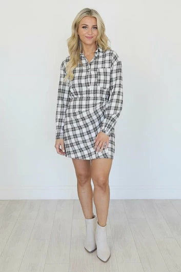 - Collared v-neckline with button front, long sleeves, and side wrap detail with mini length