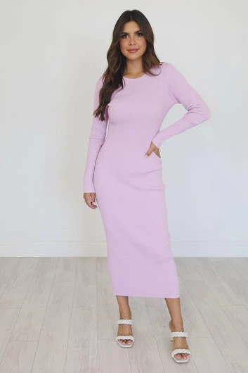 - Crew neckline with long sleeves, keyhole cutout back, and midi length
