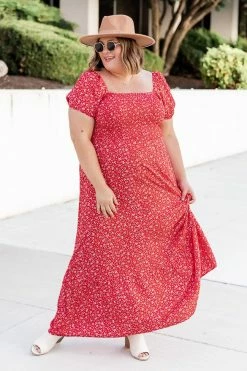 Hot Sale π Pink Lily Lovely Little Tune Red Smocked Bust Floral Maxi π Dress π